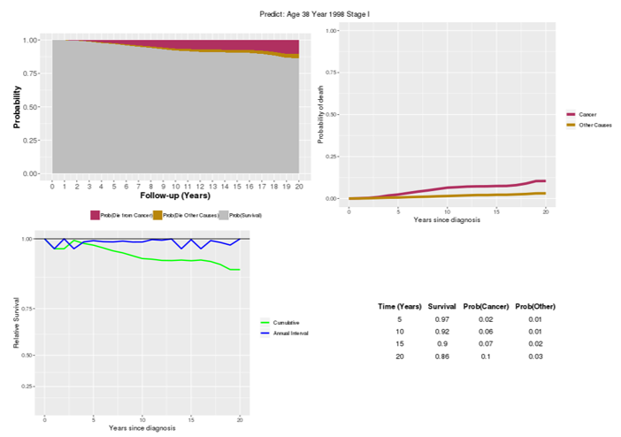 Aplicación web que permite calcular las probabilidades de supervivencia y fallecimiento por causa de diagnóstico (causa específica / cáncer) y por otras causas en una cohorte. La supervivencia esperada se calcula a partir de las tasas de mortalidad en la población española y por comunidad autónoma.
